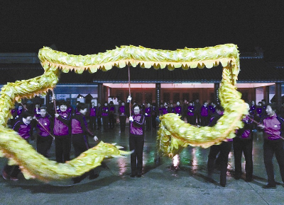 1月28日,在横涨村的文化礼堂里,200多位身穿统一服装的村民,载歌载舞,庆祝村里的广场舞团队成立2周年。横涨村广场舞健身队成立于2013年,经过两年的发展,团队规模由最初的十几个人发展到了150人。图为横涨村的女子舞龙队现场表演舞龙节目。