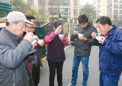 “腊八”是中国的传统节日。当天,丽洲社区邀请环卫工人到社区做客,并为他们送上腊八礼物和腊八粥,感谢他们对辖区卫生环境的辛勤维护。图为环卫工人开心地喝着社区赠送的腊八粥。
